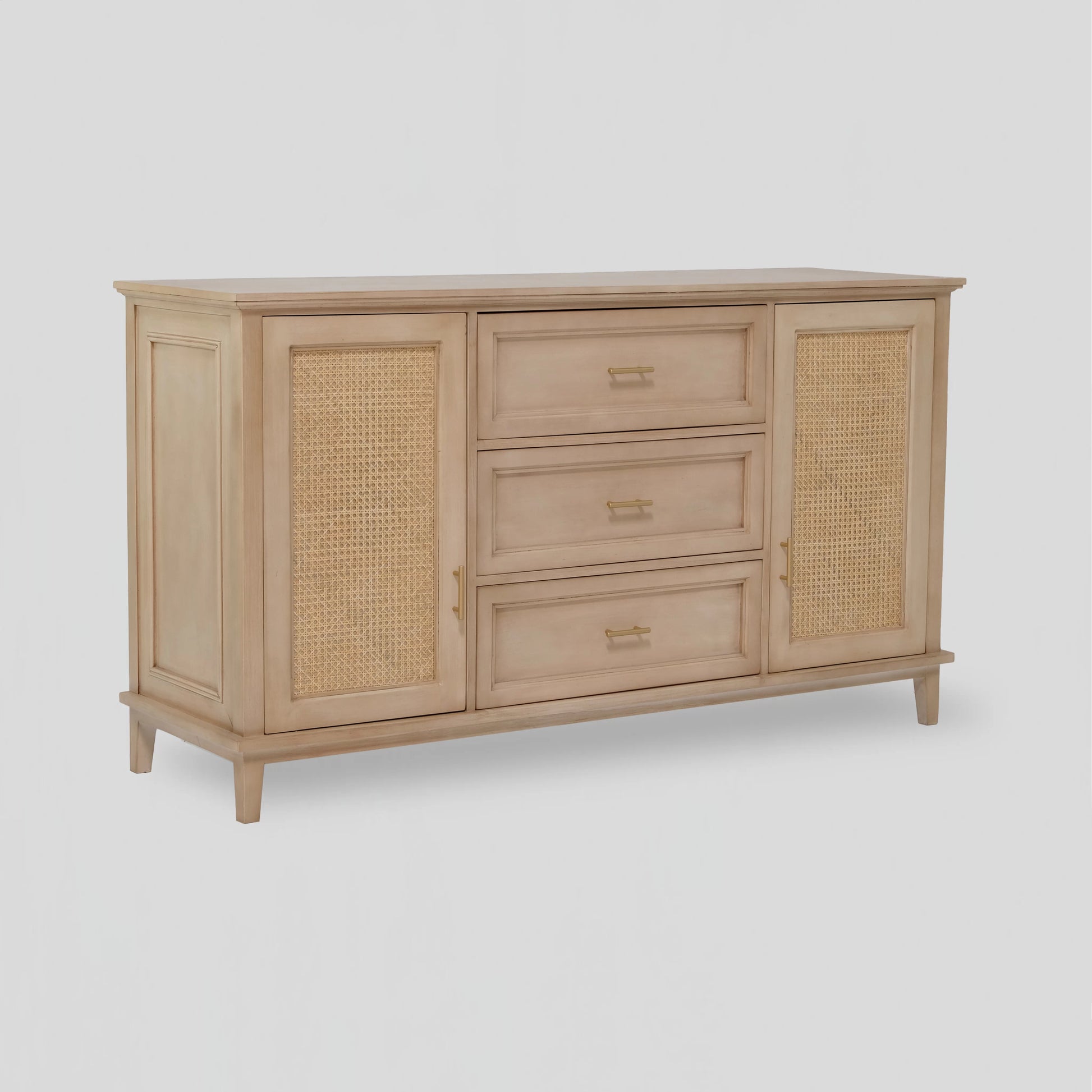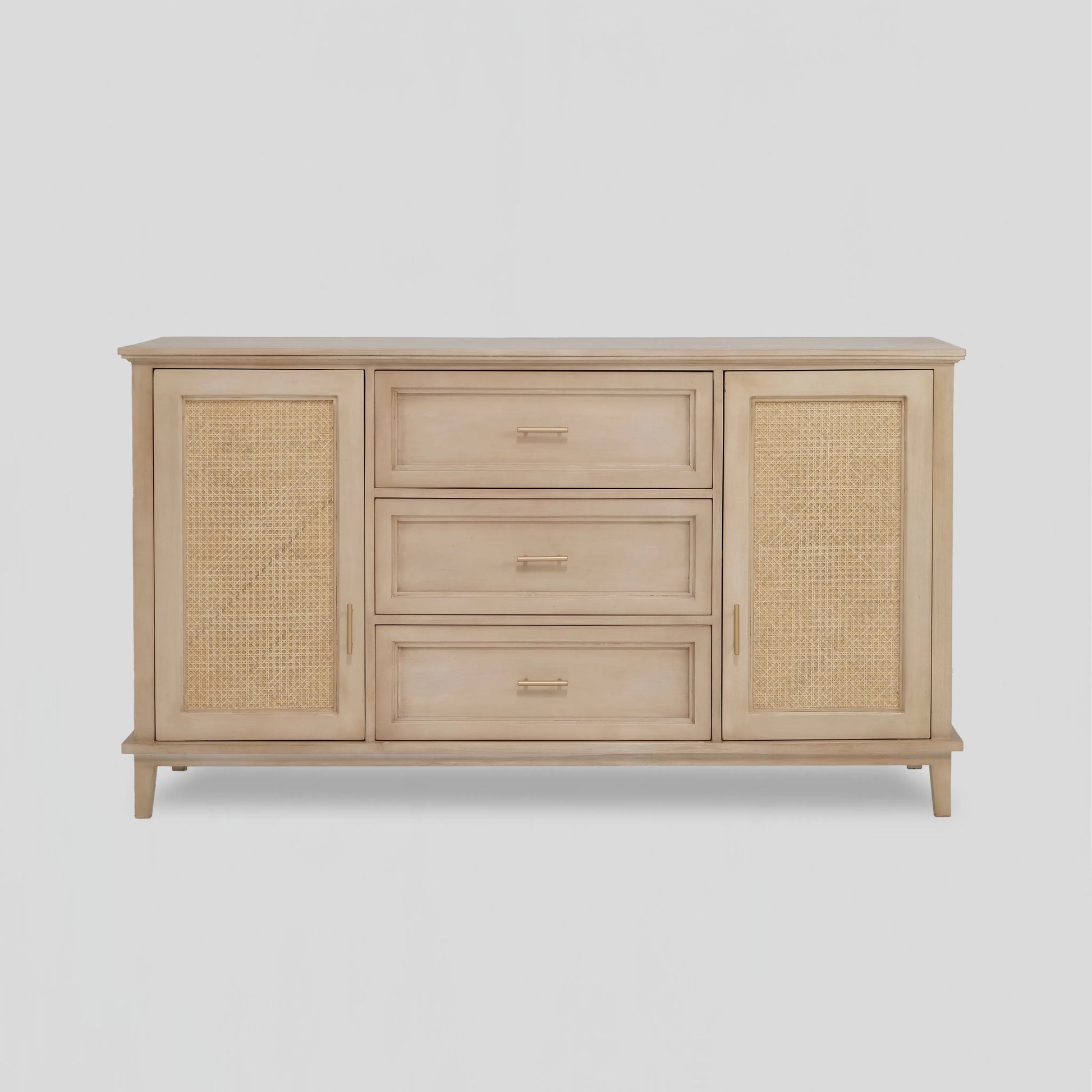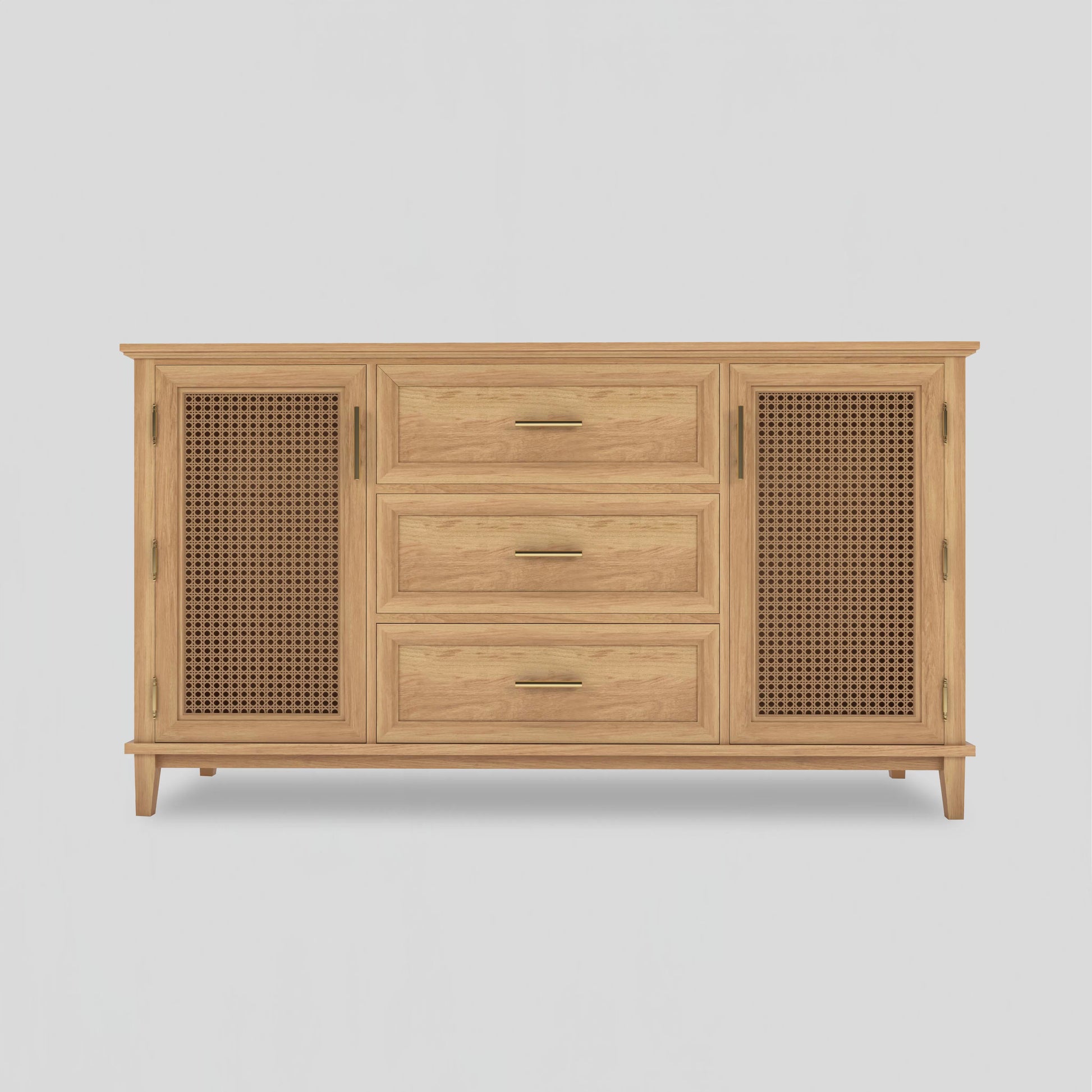 The Sandhurst Sideboard is a celebration of natural beauty and refined craftsmanship. Featuring handwoven rattan panels framed by warm oak tones, it exudes organic elegance with a timeless silhouette. Brass handles add a subtle touch of sophistication, making Sandhurst a statement of relaxed luxury — perfect for both modern Hampton and contemporary coastal interiors.